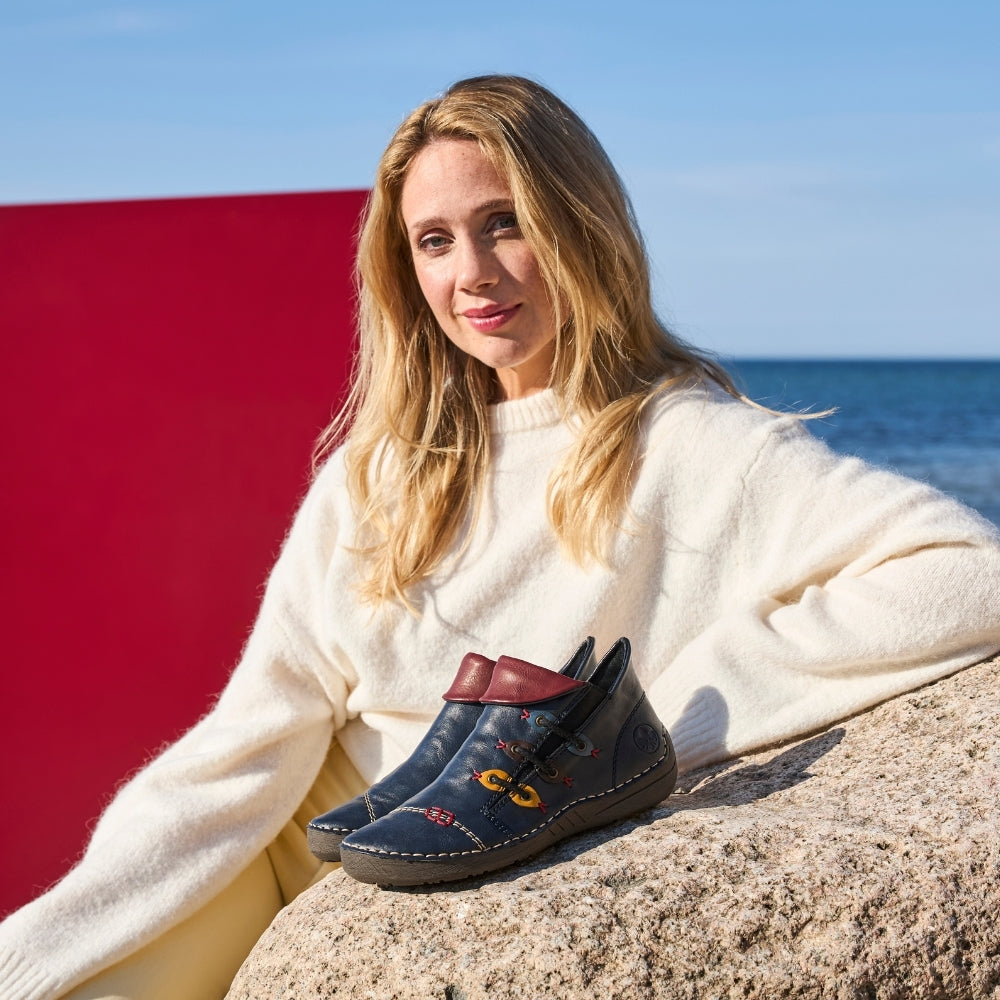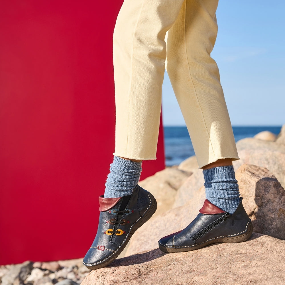 Rieker støvle til dame i blå 72581-14 kombinerer komfort med praktisk design. Støvlen har lynlås på indersiden og elastik på ydersiden, hvilket gør det nemt at tage den på og af, samtidig med at pasformen tilpasses naturligt.