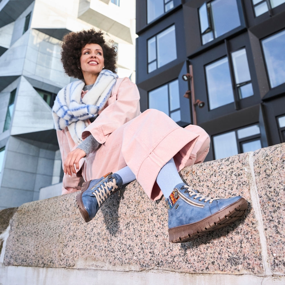 Rieker støvle til dame i blå N1305-14 kombinerer funktionalitet med et elegant udtryk. Den flotte støvle i skind er designet til at give maksimal komfort i hverdagen. Snørebåndene foran og de to lynlåse gør det nemt at justere pasformen og hurtigt tage støvlen af og på.