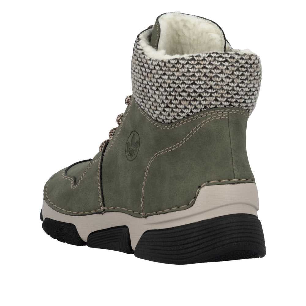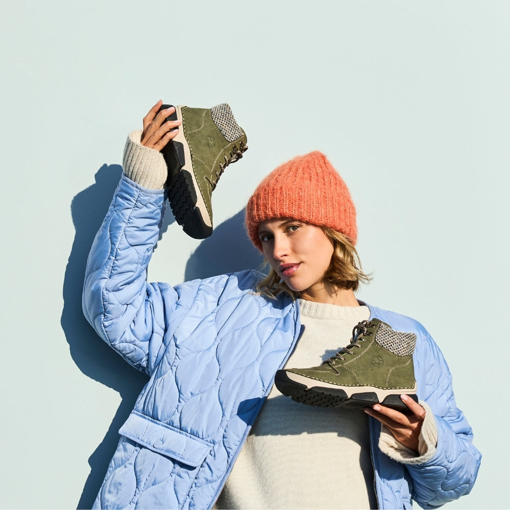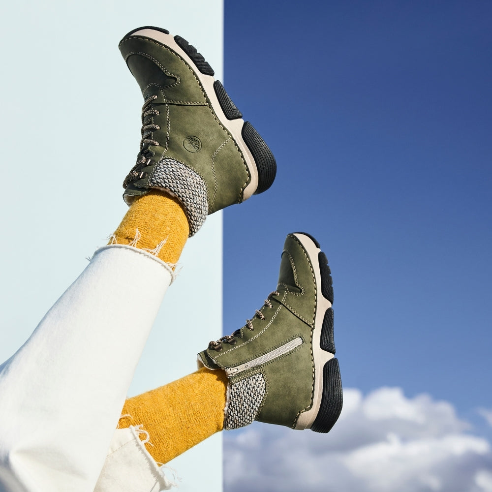 Rieker støvle til dame i grøn 45955-54 kombinerer moderne stil med høj komfort. Den flotte støvle har både snørebånd og lynlås, så du nemt kan tilpasse pasformen og tage støvlen på og af.