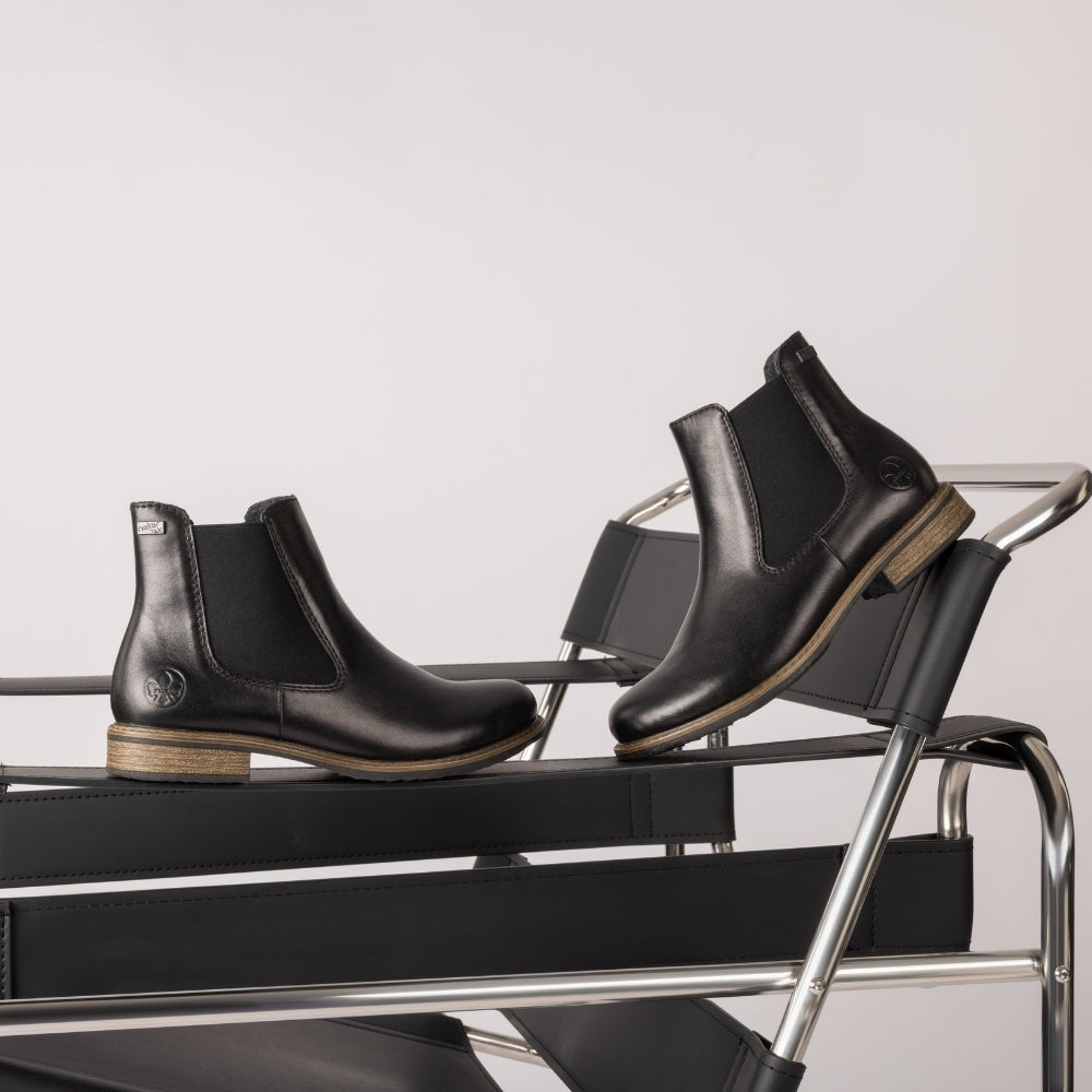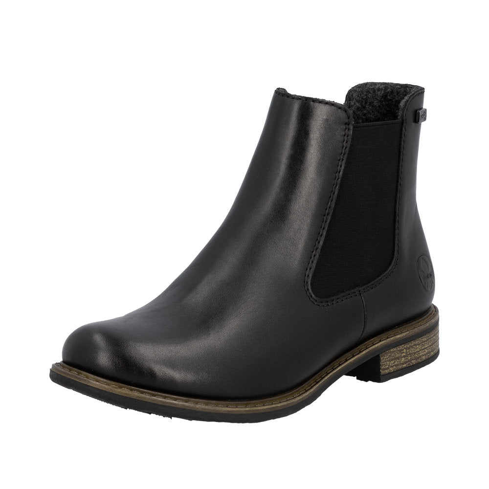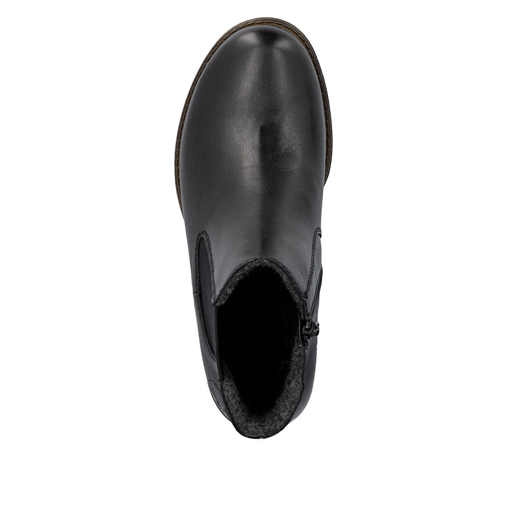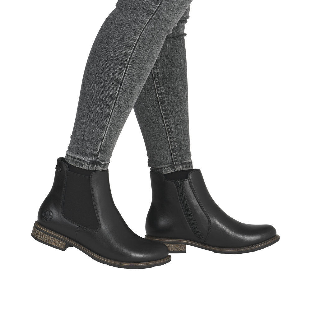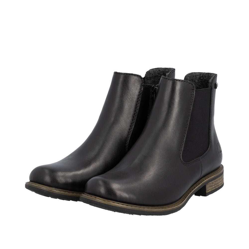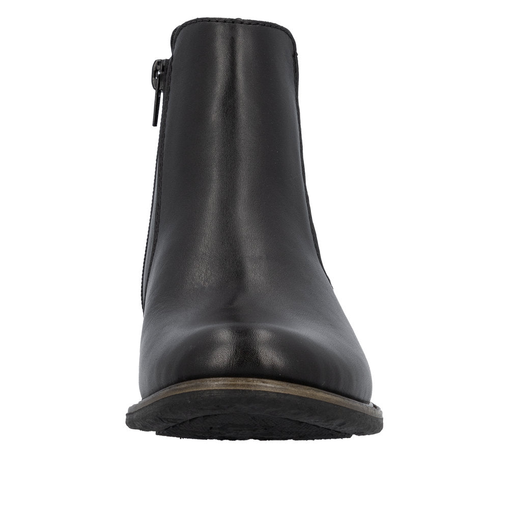 Rieker støvle til dame i sort 74870-00 er en elegant og praktisk ankelstøvle i ægte skind, perfekt til hverdagen. Støvlen har elastik i ydersiden, som giver en fleksibel pasform, og en lynlås på indersiden, der gør det nemt at tage støvlen af og på.
