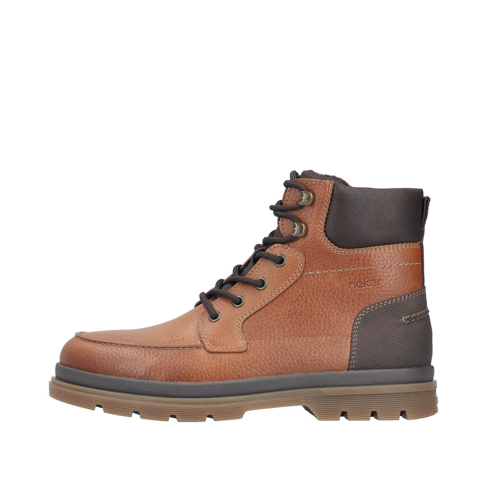 Rieker støvle til herre i brun F7041-22 kombinerer klassisk design med moderne komfort. Den brune skindoverdel giver et stilrent udtryk, mens snørebånd og en funktionel lynlås på indersiden gør støvlen nem at tage på og af samt justere efter behov.