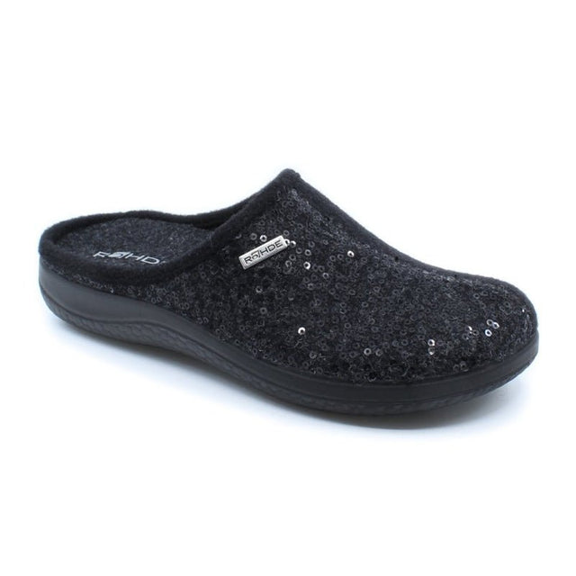 Rohde 6550-40 er en komfortabel og stilfuld hjemmesko til damer, designet i blødt uldfilt med fine små pailletter på den ene side, som giver et elegant og feminint touch.
