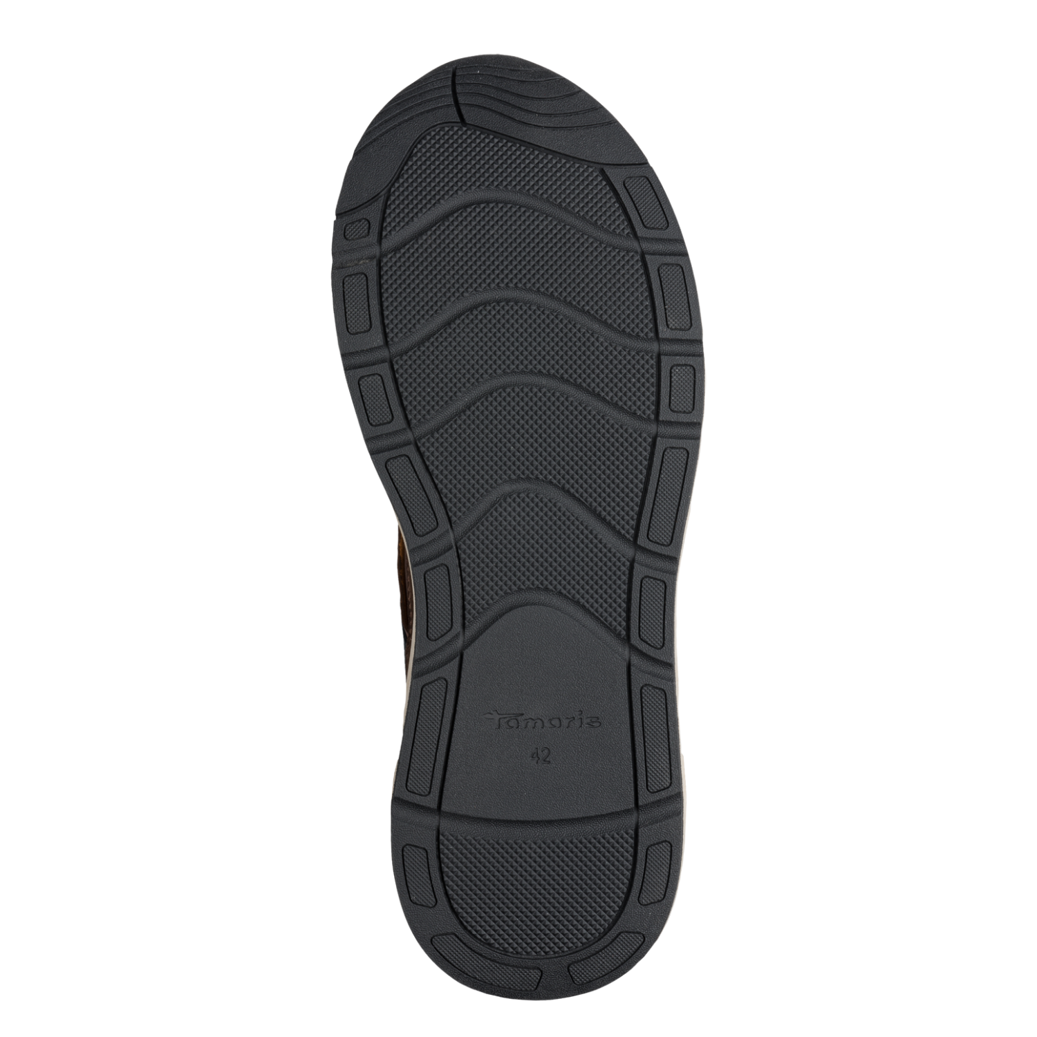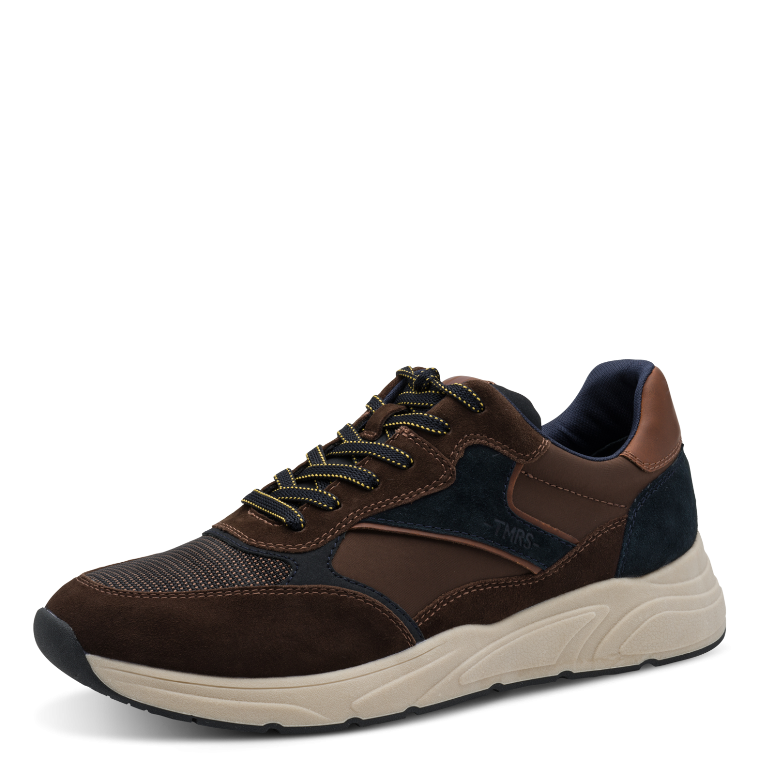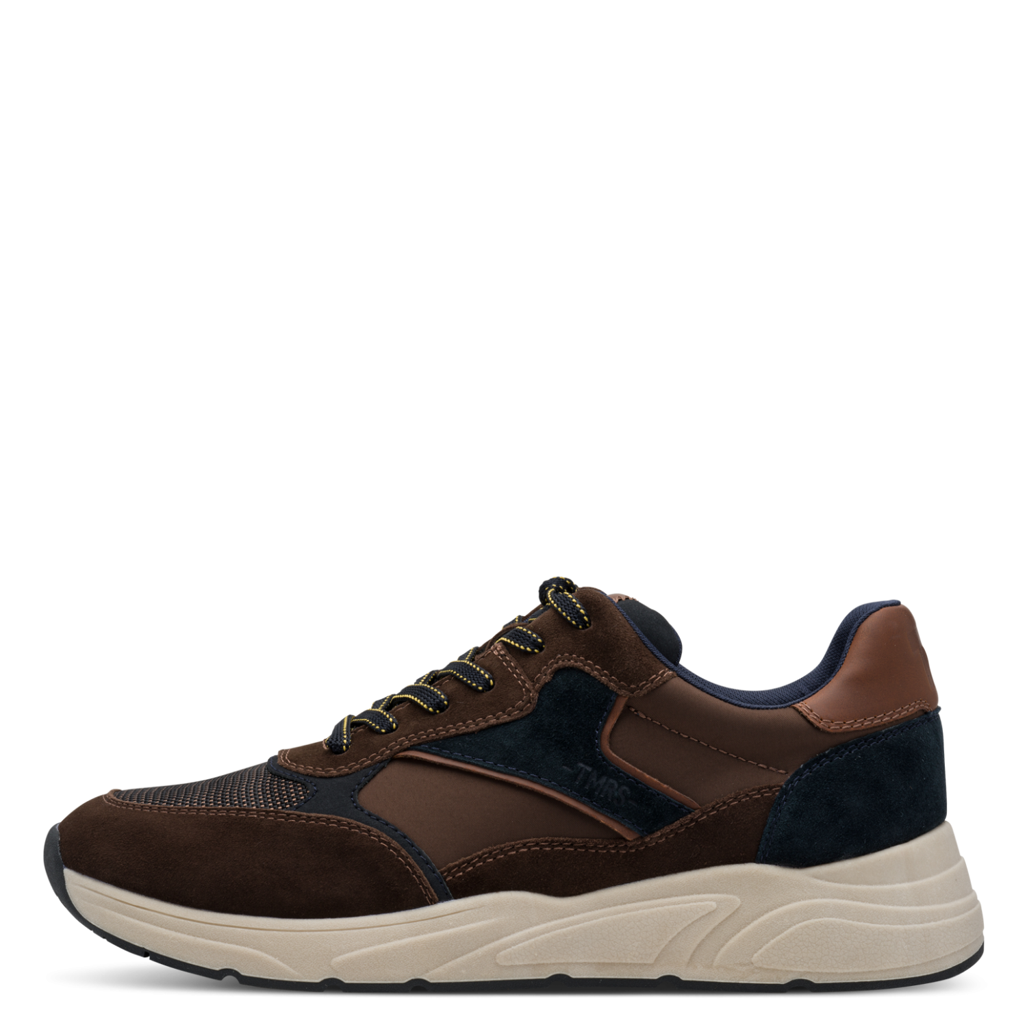 Tamaris 13611 er en stilren herresneaker i mørkebrun ruskind med flotte navy detaljer. Skoen er skindfoeret for ekstra komfort og åndbarhed, mens den cremefarvede ydersål giver et moderne og let udtryk. En komfortabel og alsidig sneaker, perfekt til både hverdag og pænere brug.